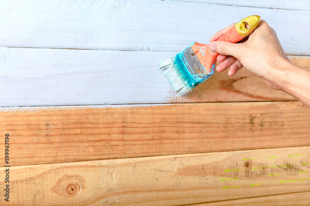 Hand Holding Paint Brush And Painting On Wood Wall With White Color Stock Photo Adobe Stock